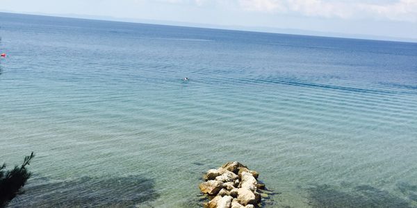 60 lush olive trees dot the property along with an orchard of pear, apricot and apple trees. Numerous plants and flowers can be found throughout the property. They eventually lead downhill through a cluster of tall pine trees to the virtually private beach and clear blue Agean waters.